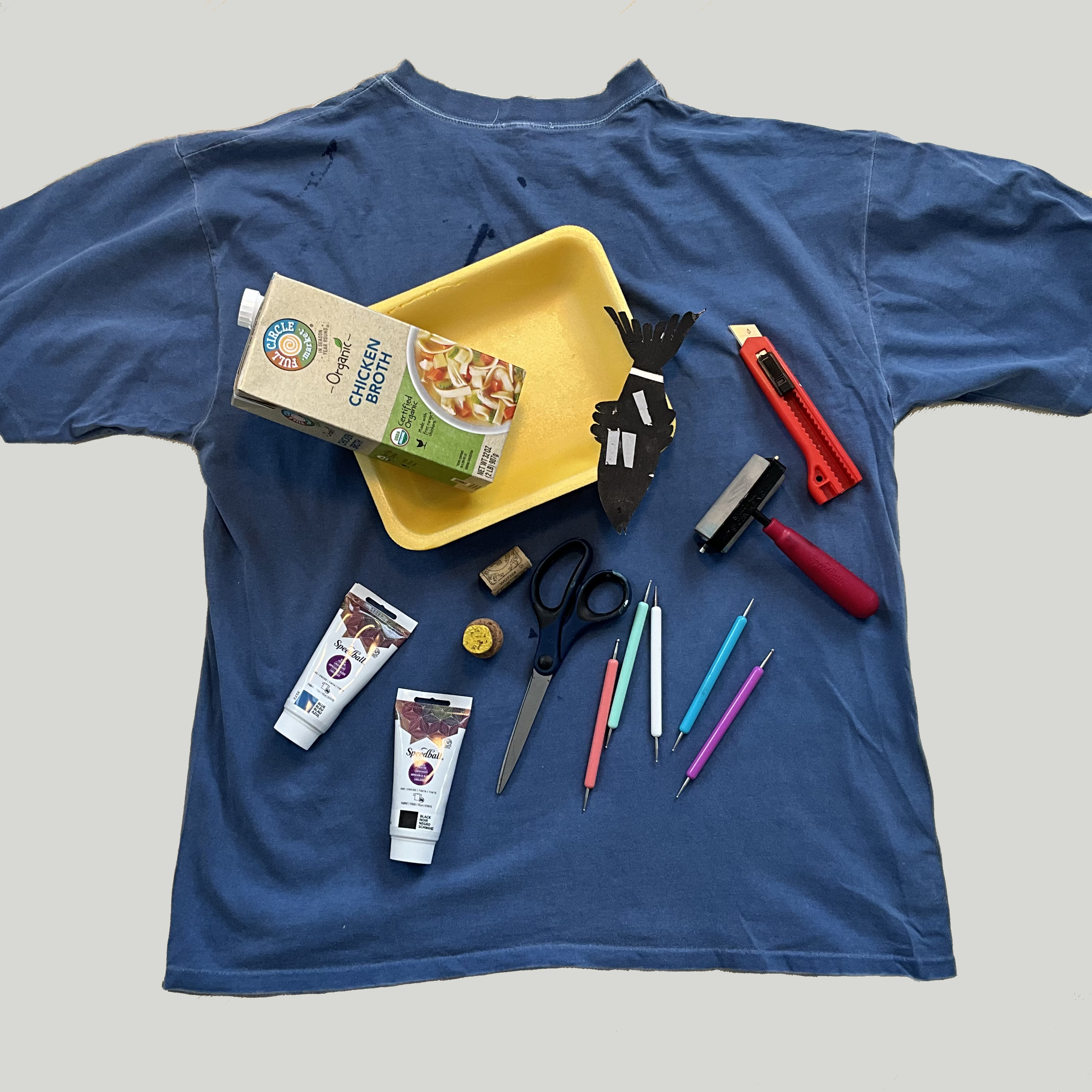 Materials provided: Upcycled foam trays, fabric inks, brayers, rollers, exacto knives, cardboard, upcycled surfaces suitable for carving.