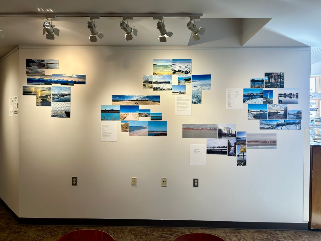 Fifteen days to meet, create, and exhibit — five voices, three works: a photo-based collage tracing the US coastal lines where we each come from and a painting born from six hands meeting in a single upcycled drop, both exhibited at Kenai Peninsula College, while a ceramic earth work installation shaped by one exhibited at the Pratt Museum.