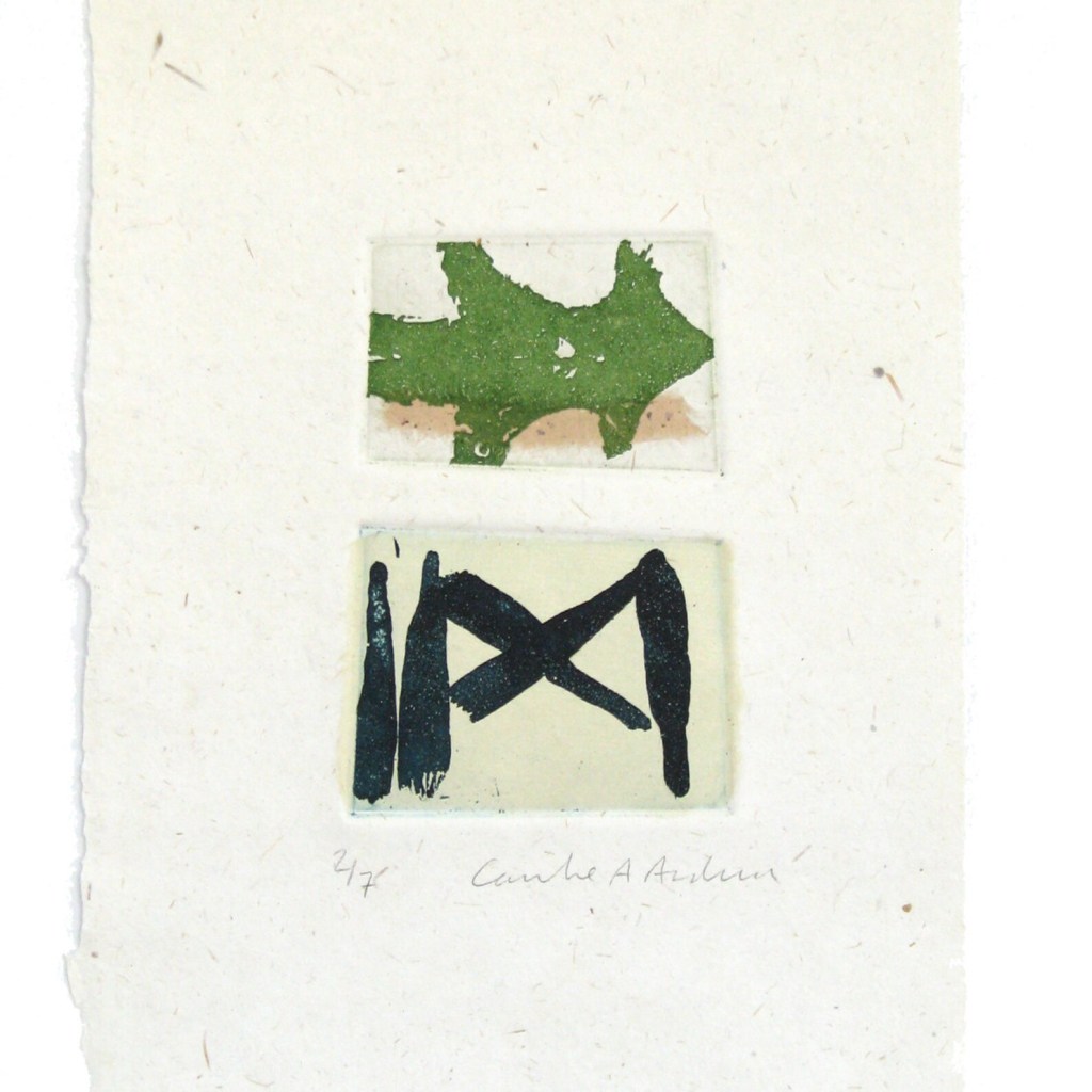 Caroline Anderson, “Leaf and Rune” aquatint and chine collé on handmade paper